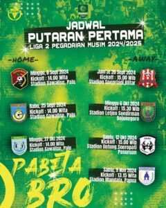 – Persipal Palu VS Gresik United, Rabu (25 September 2024) di Stadion Gawalise Palu. Kick Off 14.00 WITA