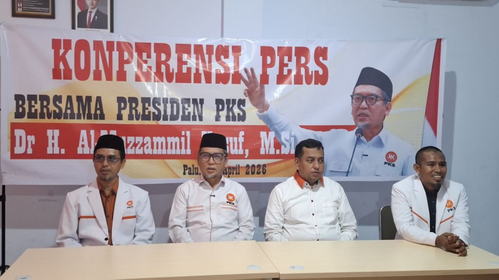 Presiden PKS, Al-Muzzammil Yusuf (dua dari kiri) didampingi pengurus DPP Umar Salim memberikan keterangan pers di kantor DPW PKS Sulteng, Ahad (5/4/2026). FOTO: EKBISTA.COM